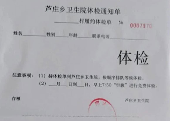 ΪÁËÈøü¶àµÄ´åÃñ²ÎÓëÌå¼ì£¬ÔÚÌå¼ì»î¶¯¿ªÊ¼Ç°£¬´åÎÀÉúÊÒµÄÏç´åÒ½Éúͨ¹ýÉÏÃÅÈë»§·¢·ÅÌå¼ì֪ͨµ¥µÄ·½Ê½Í¨Öªµ½ËùÔÚ´å´åÃñ¡£ÏÂͼΪÌå¼ì֪ͨµ¥£º