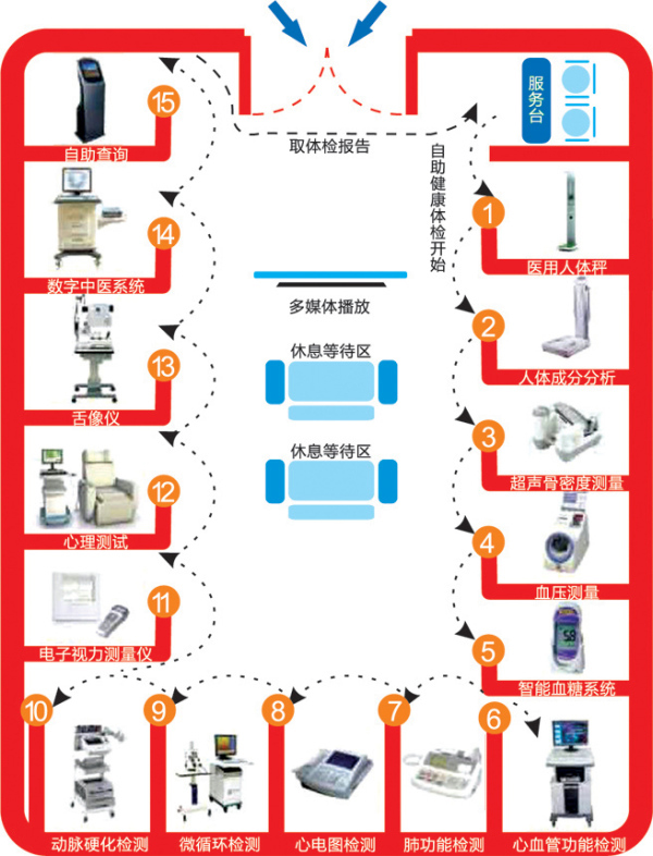 ×ÔÖúʽ½¡¿µÐ¡ÎÝÖ÷ÒªÅ䱸Ðĵçͼ¡¢ÈËÌåÖ¬·¾¡¢ÑªÑ¹¡¢Éí¸ßÌåÖØ¡¢¹ÇÃܶȡ¢ÑªÌÇ¡¢·Î¹¦Äܼ°ÐÄѪ¹Ü¹¦Äܰ˸ö¼ì²âÏîÄ¿¡£È«²¿Íê³Éºó»á´òÓ¡±¨¸æµ¥£¬Í¬Ê±»¹Óн¡¿µÖªÊ¶µÄÐû½Ì¡£